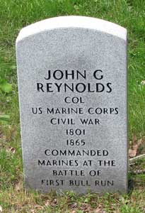 REYNOLDS, JOHN G. (1801-1865). Colonel, United States Marine Corps. Born in New Jersey, he was commissioned as a second lieutenant in the Marine Corps on May 26, 1824. During the Battle of Bull Run, Virginia, on July 21, 1861, Reynolds, who had the rank of major, commanded a Marine Battalion on Henry House Hill. Stonewall Jackson’s Brigade routed his recruits, who were inexperienced. He acknowledged their greenness in his battle report three days later from Washington, D.C., and went on to add: