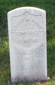 RADER, LOUIS B. (1837-1881). Corporal, 7th Regiment, New York State National Guard, Company C. A German native, Rader joined the 7th Regiment in 1861, enlisting as a corporal on April 19 and mustering out with his company on June 3. He returned to the same company as a private for 30 days in 1863. He belonged to the Lafayette Post #140 of the G.A.R., joining on February 14, 1881, and dying of diabetes less than a month later, being the first member of his post to die. His last residence was 304 West 58th Street, New York City. Section 117, lot 1641.