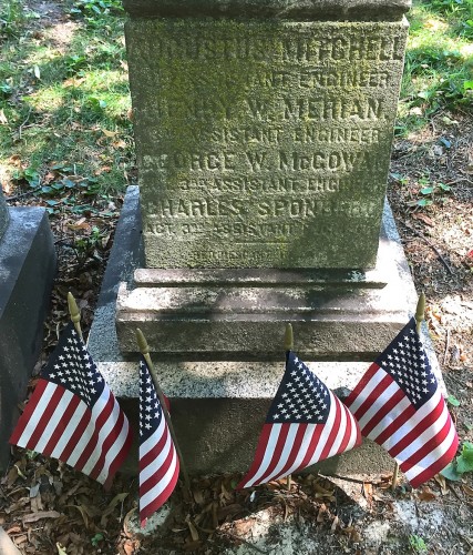 The monument is inscribed on its front to Third Assistant Engineers Augustus Mitchell , Henry W. Merian, George W. McGowan, and Charles Sponberg.