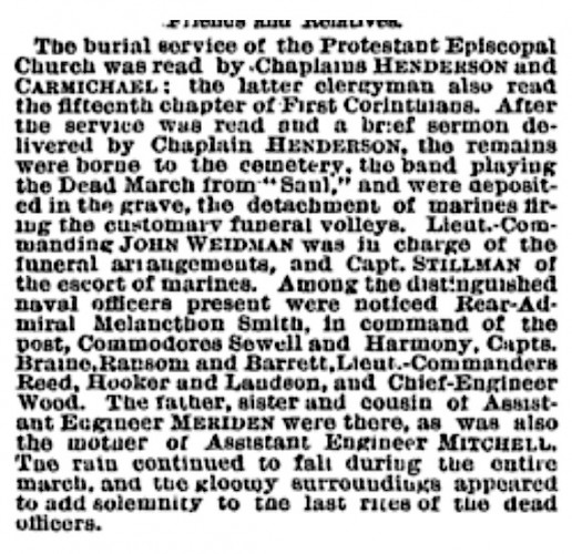 The remains of these men lay in the sunken ship until 1871, when they were recovered. On September 27, 1871, The New York Times reported that the funeral at the Brooklyn Navy Yard for the four assistant engineers was “a solemn and imposing spectacle . . . a very impressive pageant.” The bones of the 4 men had been gathered and placed in a rosewood casket. A silver plate on the casket identified them by name and rank. The Marine Band played. A funeral service was held at the Navy Yard Chapel, then the procession proceeded to Green-Wood, where a band played, Naval officers gathered to pay tribute, and Marines fired volleys in salute.