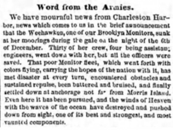 Returning to the harbor at Charleston, South Carolina, the Weehawken assisted in the bombardments of Forts Wagner and Sumter there. After running aground on September 7, the Weehawken again was repaired and became part of the naval blockade of Charleston that October. But, on December 6, the Weehawken suddenly sank in a gale while at anchor off Morris Island. Four engineers and 27 other crewmen, trapped below decks, drowned.