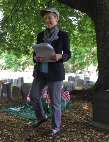 Baseball historian and author Tom Gilbert talking about Duncan Curry, one of James Whyte Davis’s Knickerbocker teammates, at Curry’s grave. His gravestone, put there by his son, describes him as a “Father of Base Ball.”