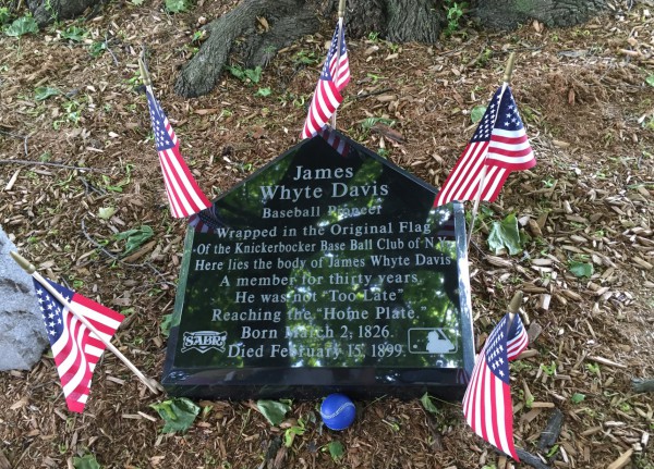 In 1893, as James Whyte Davis contemplated his death, he came up with a plan: players and management of the National Baseball League would contribute 10 cents each to honor him with a gravestone. He would save them much work by writing his own epitaph. But, by 1893, James was long-forgotten, and the plan went nowhere. He died in 1899 and was interred, as he had planned, wearing his Knickerbockers uniform and wrapped in the old and tattered Knickerbocker flag. But he got no gravestone.