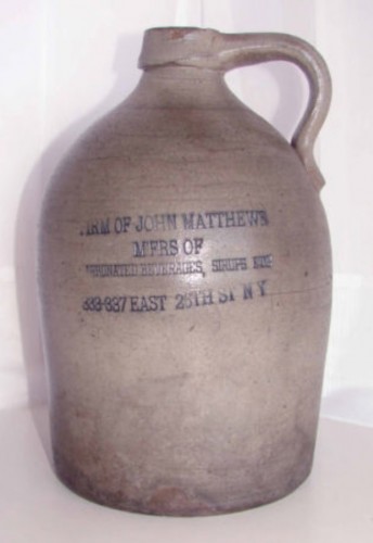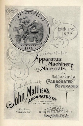 John Matthews (1808-1870) trained in his native England in the manufacture of devices to carbonate drinks. He immigrated to New York City in 1832 and established his business at 55 Gold Street in Manhattan, where he made carbonated drinks popular and manufactured elaborate soda fountains.