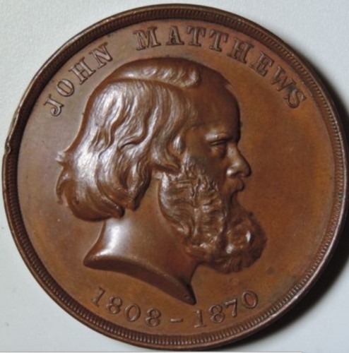 Coin with portrait of John Matthews, “The Soda Fountain King,” showing his life dates. It is dated 1882 on the other side; Matthews was still revered 12 years after his death.