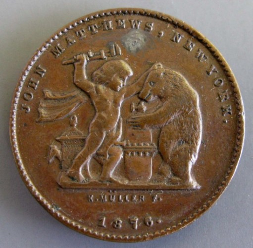 This coin, advertising "Matthews' Soda Water Apparatus," was designed and signed by Karl F. Muller, who also designed the Matthews Monument at Green-Wood. The token was issued in 1876.