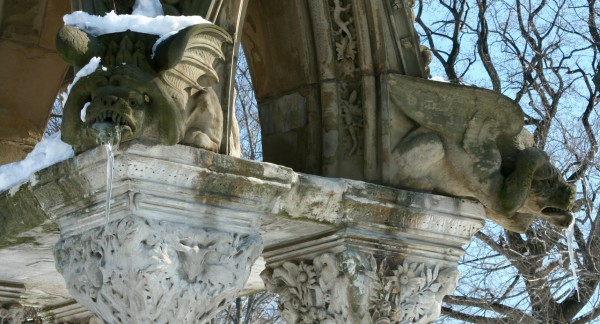 A dream come true: for years I wanted to get a photograph of the water, running off the roof of the Matthews Monument and into the mouths of the gargoyles, then frozen into icicles. Here it is!