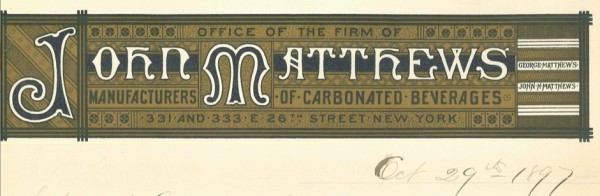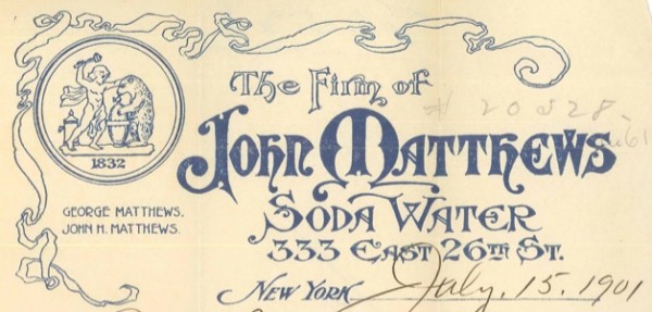 When the “Soda Fountain King” retired, his Manhattan manufacturing plant, then on First Avenue stretching from 26th to 27th Street, was immense. Matthews was the largest manufacturer in the soda fountain industry and was known as “the Neptune of the trade.” By the time of his death, more than 500 establishments in New York City alone were using his soda fountains.