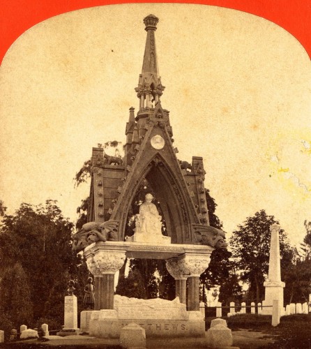 A half-stereoscopic view of the Matthews Monument, circa 1875. It rose 36 feet. Green-Wood Historic Fund Collections.