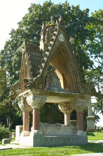 It would be impossible to blog about John Matthews without discussing his spectacular memorial at Green-Wood. It is a wonder! This exuberant work, shown below, was designed by Karl Muller (1820-1887), a German and French-trained goldsmith and sculptor who immigrated to the United States around 1850. Its overall form was of a type typically reserved for royalty, Popes, and the elite.