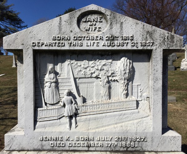 The Griffith Monument has a touching back story. Erected to “Jane, My Wife,” it memorializes Jane Griffith (1816-1857)–just 41 years old when she died. She was not famous, but was much loved by her husband Charles. On the morning of August 3, 1857, in a typical domestic scene of the time, she stood on the steps of their wisteria-covered brownstone at 109 West 13th Street in Manhattan, with a cast iron fence marking their lot, dog at her side, bidding her husband goodbye as he headed off to the waiting Sixth Avenue horsecar that would take him downtown to work. Sadly, when Charles returned home that evening, he found Jane dead of a heart attack.