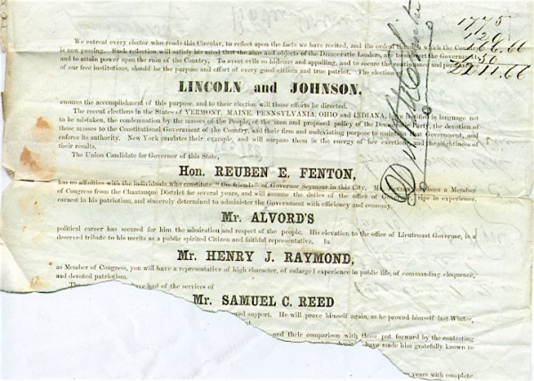 This handbill was produced for the 1864 Presidential election–in the midst of the Civil War–for the Republican ticket. After noting “the ordeal through which the Country is now passing,” it accused the opposition, “Democratic leaders,” of aiming “to subvert the Government and to attain power upon the ruin of the Country.” The re-election of President Abraham Lincoln would “avert evils so hideous and appalling . . . .” Further down, the handbill endorses “Mr. Henry J. Raymond” for Congress as a “a representative of high character, of enlarged experience in public, of commanding eloquence, and devoted patriotism.” Raymond was a co-founder of The New York Times, its editor, and chair of the national Republican Party. Here he is: