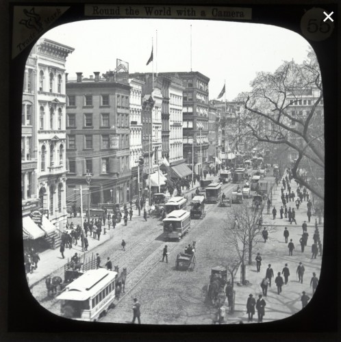 In this collection, the viewer encounters buildings, transportation street signs and businesses that have either miraculously survived the passage of time or have long ago faded into the past. We see faces and neighborhoods that look familiar and experience both a shock of recognition and a sense of disquiet—the view is somehow the same, yet everything has changed. We know this place, this city—it is all around us—and yet the lively world we are looking at and the faces that return our gaze through this small square of glass, seemingly so full of life, no longer exist. The lantern slide offers a unique glimpse into this vanished world.
