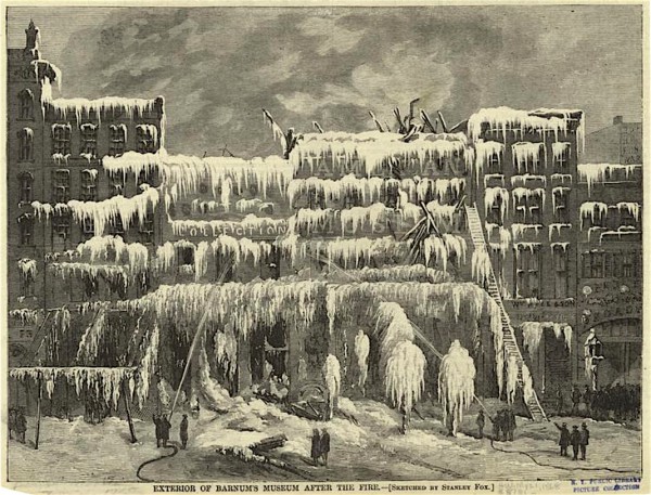 Some of these photographs date from the 1860s but were published as lantern slides several decades after they were taken. For instance, the ruins of P.T. Barnum’s Museum, on Broadway, were photographed in March 1868, just after the fire there (Barnum’s museums and circuses suffered repeated fires–in 1864, 1865, 1868, and 1872):