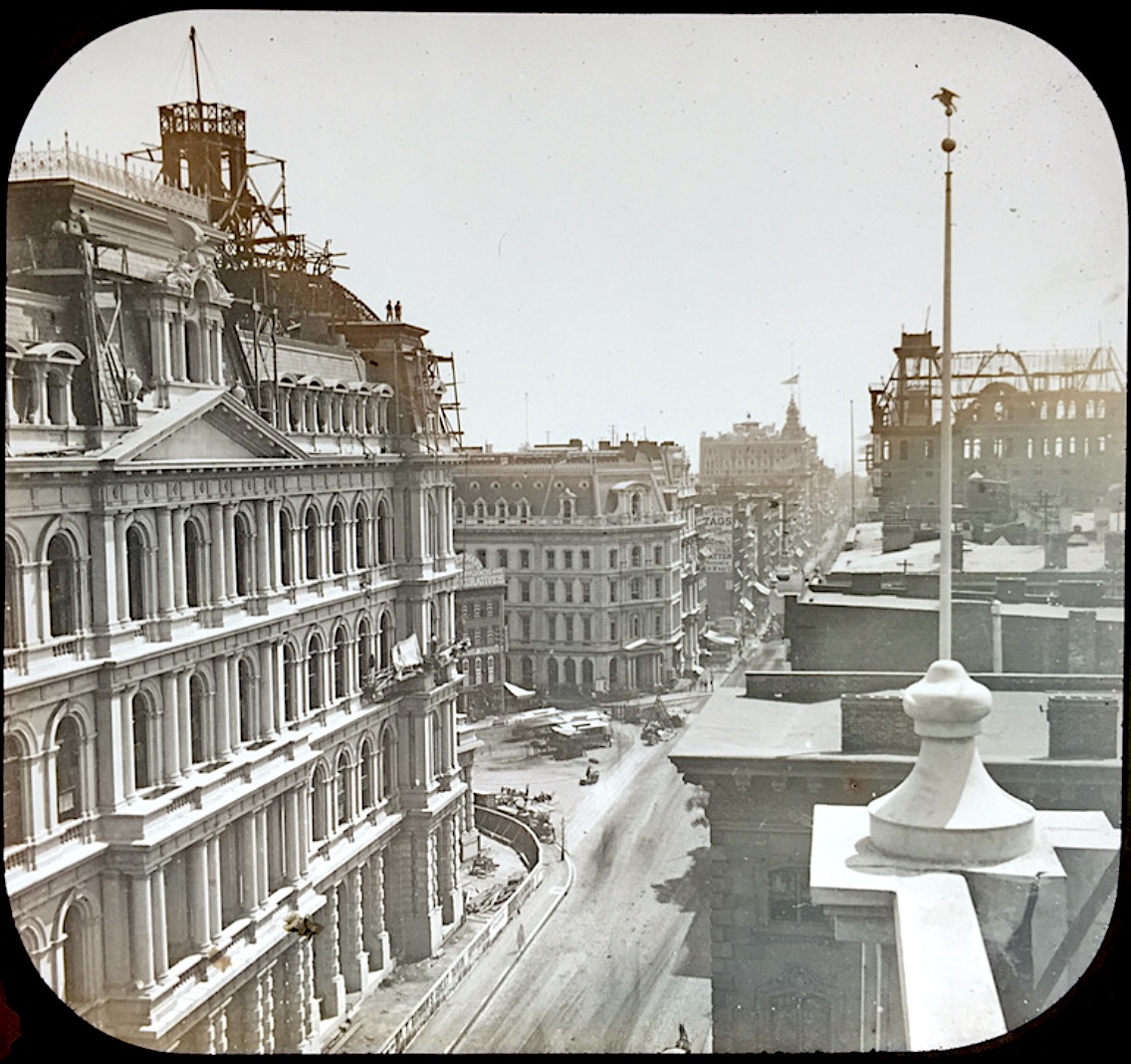 Some of these photographs date from the 1860s but were published as lantern slides several decades after they were taken. For instance, the ruins of P.T. Barnum’s Museum, on Broadway, were photographed in March 1868, just after the fire there (Barnum’s museums and circuses suffered repeated fires–in 1864, 1865, 1868, and 1872):