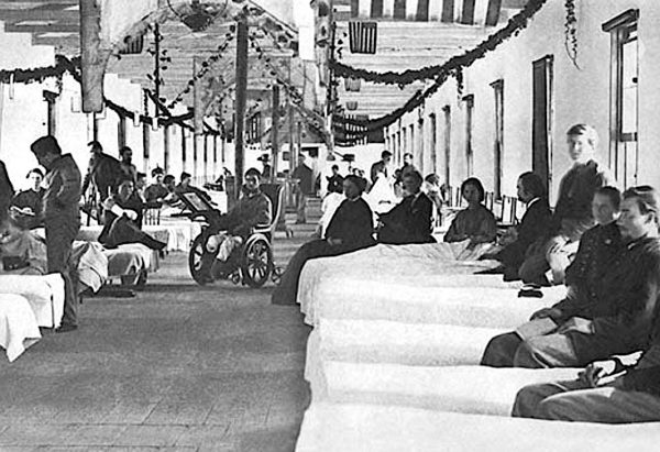 The sick and wounded inside a ward at Armory Square Hospital, late in the Civil War. Both Union and Confederate soldiers, sick and wounded, were treated there.