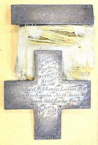This custom item, in the shape of the cross symbolic of the Sixth Corps of the Army of the Potomac, to which the 6th Maryland Infantry was assigned, is inscribed with the names of the many battles that Clifton Kennedy Prentiss fought in. Note that the fabric ribbon, a century and a half old, connecting the two metal pieces, is coming apart.