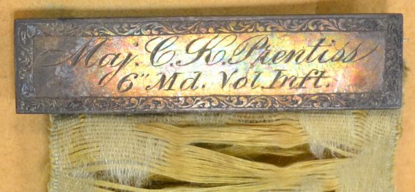 The metal bar at the top of the medal, above the ribbon, identifies it as the property of Major C.K. Prentiss of the 6th Maryland Volunteer Infantry.