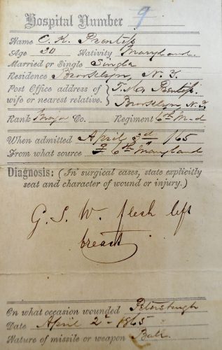 This hospital form records Clifton Kennedy Prentiss’s residence as Brooklyn, New York. “G.S.W.” is for gunshot wound; its records that injury to the flesh of his left breast.