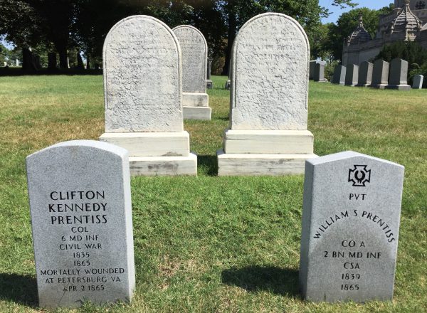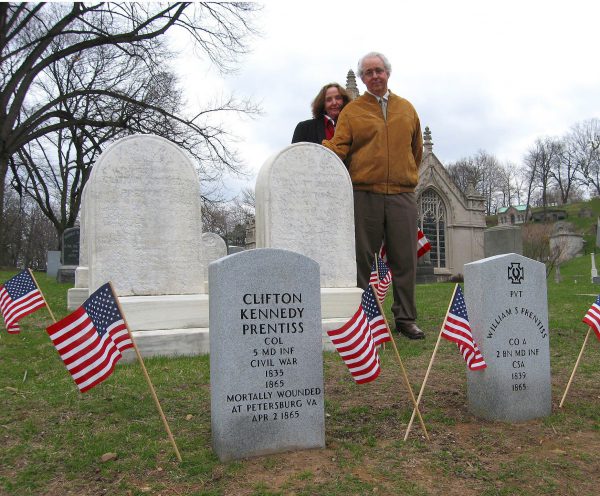 David H. Jones is the author of Two Brothers–One North, One South, a fictionalized account of the Prentiss brothers. In 2008, David and his wife, Dian, unveiled the VA gravestones that volunteers with Green-Wood’s Civil War Project had obtained for Clifton and William. Note that Clifton’s new gravestone here–gray granite–specifies his service in the 5th Maryland. This stone has since been replaced with one featuring his service in the 6th Maryland–the regiment that he led in the April 2 attack, when he was mortally wounded. The original white marble gravestone for Clifton is at back left; that for William is at right rear, next to David.