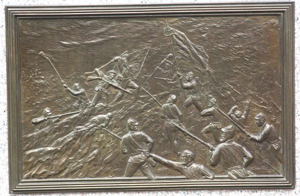 This bronze was installed a few years ago at Pamplin Park, which now owns the fortifications that Clifton and his regiment attacked and which William defended. The Union soldiers are at right, attacking behind the color bearer carrying the United States flag. The fortifications and the Confederates are at left. Near this bronze is a sign telling the story of the Prentiss brothers.