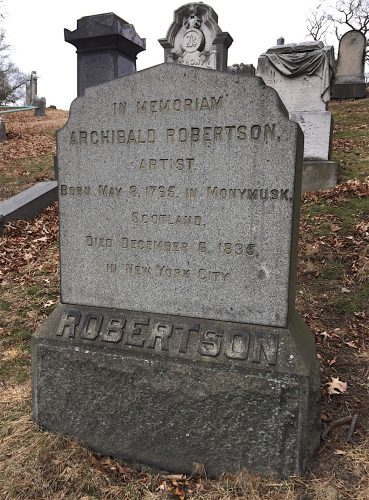 Given all of this information, the conclusion is apparent: Archibald Robertson, artist, is interred at Green-Wood–or at least the “box of bones” that likely contains his remains is. It seems likely that, in digging up three bodies, one of them was already out of its casket (perhaps from earlier disinterments from the churchyard) or then came out of its casket–so that the remains that were transported from the North Dutch Church to Green-Wood in 1862 were two identified bodies and a “box of bones.” Because this was well before DNA testing, there was no way to definitively determine that those bones were the remains of Archibald Robertson. But, because Archibald Robertson’s family is interred in this lot, it appears–based on the factors discussed above–that his remains–little more that a “box of bones”–are there also, with a granite stone dedicated to him, “In Memoriam.” Though Green-Wood’s records do not reflect the interment of Archibald Robertson, artist, it does appear that what remained of him–sadly no more than a “box of bones”–was interred at Green-Wood on June 11, 1862.