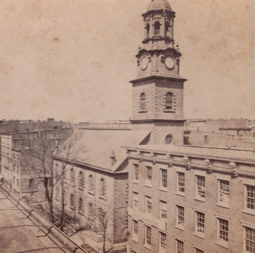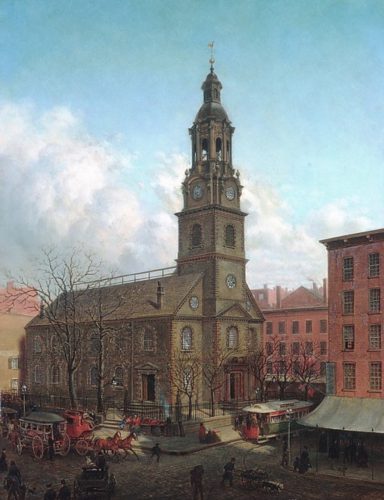 During the Revolutionary War, the British desecrated this church, shipping its pulpit off to England and burning its pews and woodwork for fuel. They used the church to store grain, as a hospital, and for the imprisonment of up to 2,000 poor souls at a time. After the British evacuation in 1783, the church was restored. Here is a photograph of its fine interior, as it looked circa 1860: