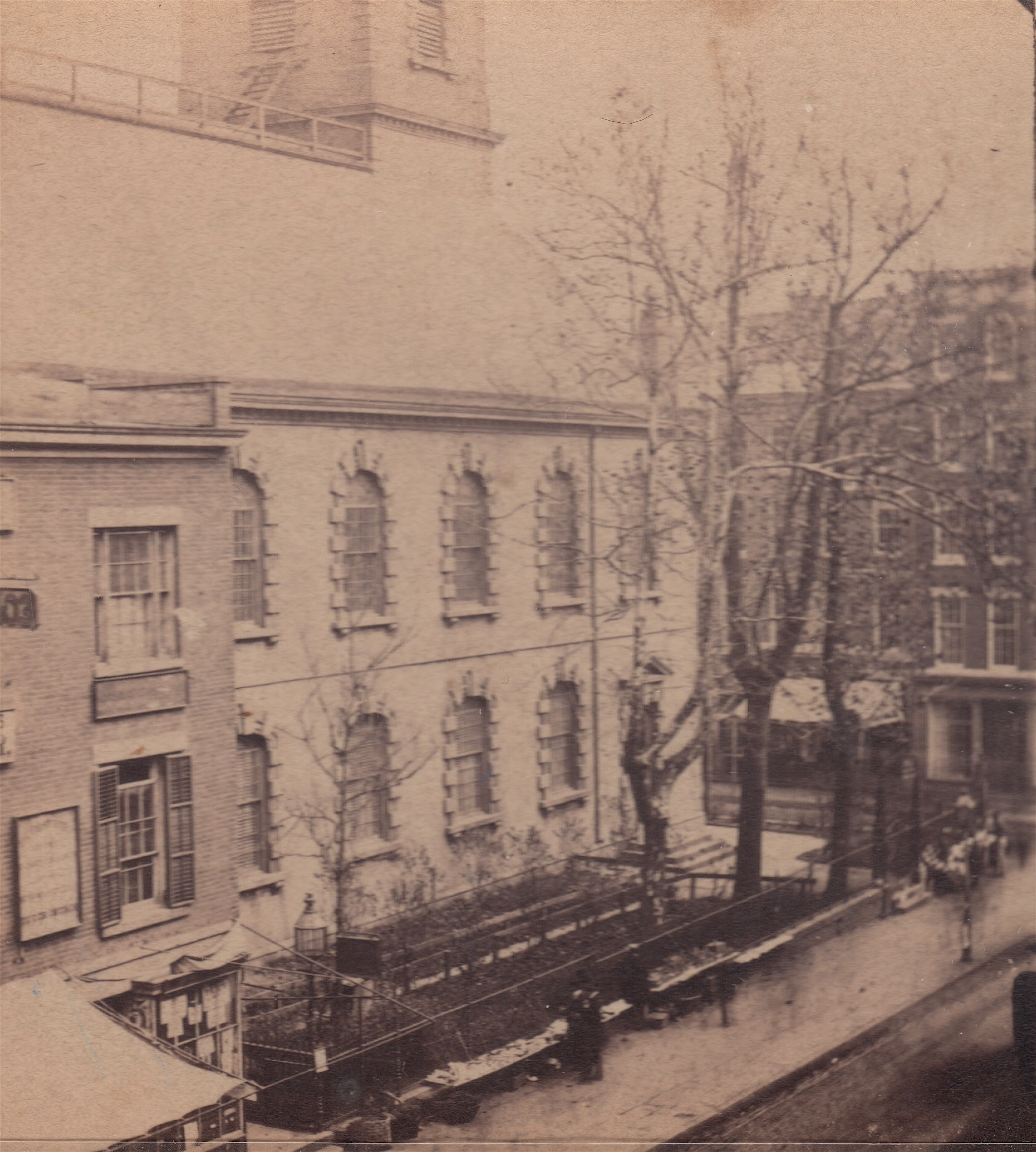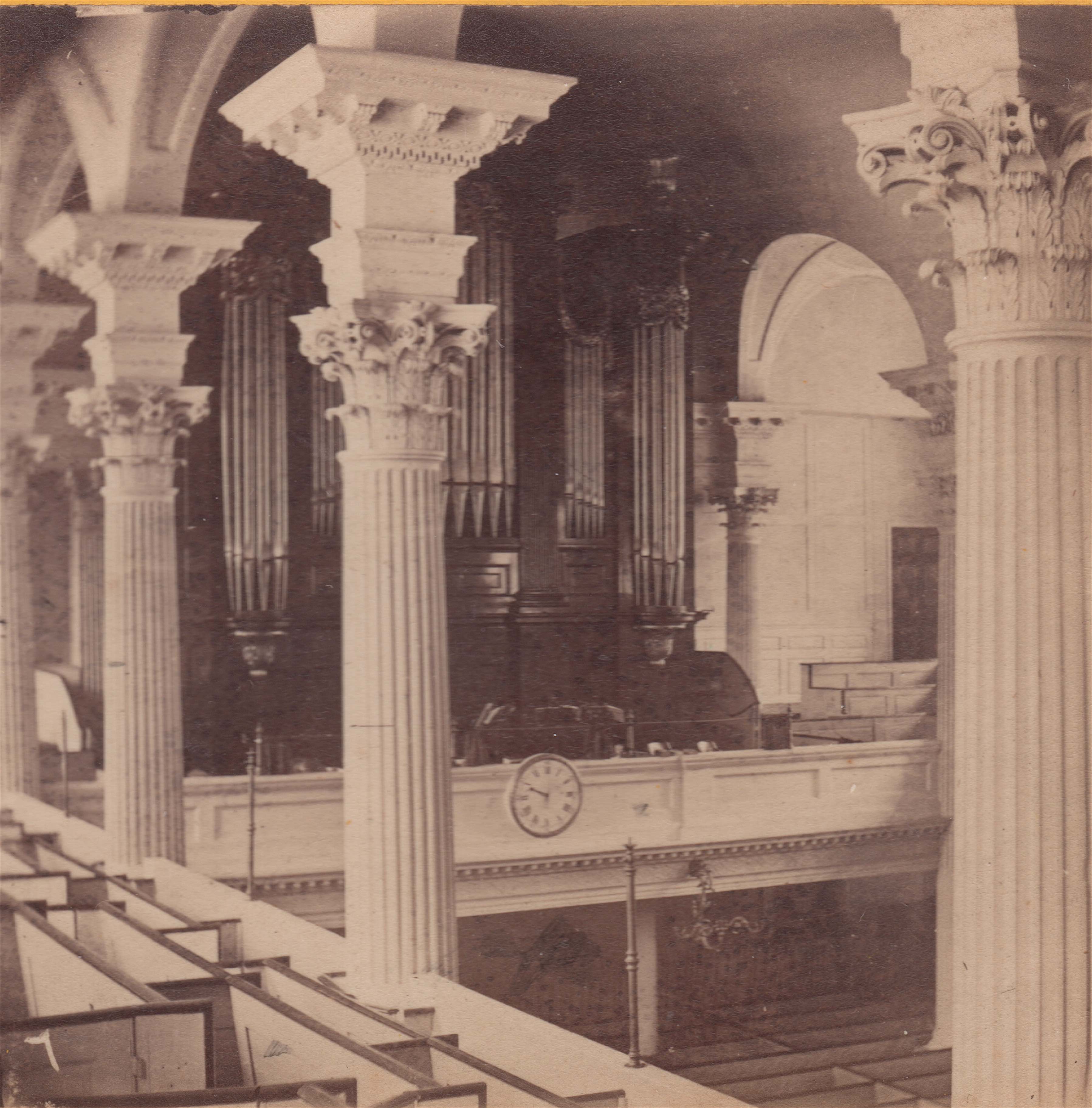During the Revolutionary War, the British desecrated this church, shipping its pulpit off to England and burning its pews and woodwork for fuel. They used the church to store grain, as a hospital, and for the imprisonment of up to 2,000 poor souls at a time. After the British evacuation in 1783, the church was restored. Here is a photograph of its fine interior, as it looked circa 1860:
