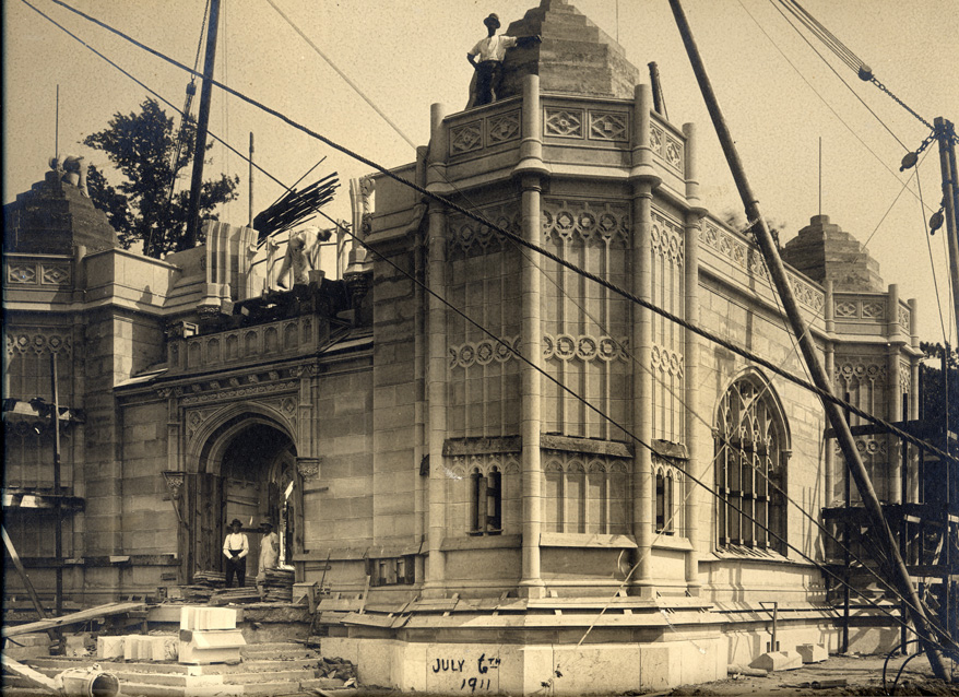This is one of a set of magnificent construction photos of the Historic Chapel, taken by a photographer who specialized in architectural photographs as it was being built, in the collections of The Green-Wood Historic Fund.
