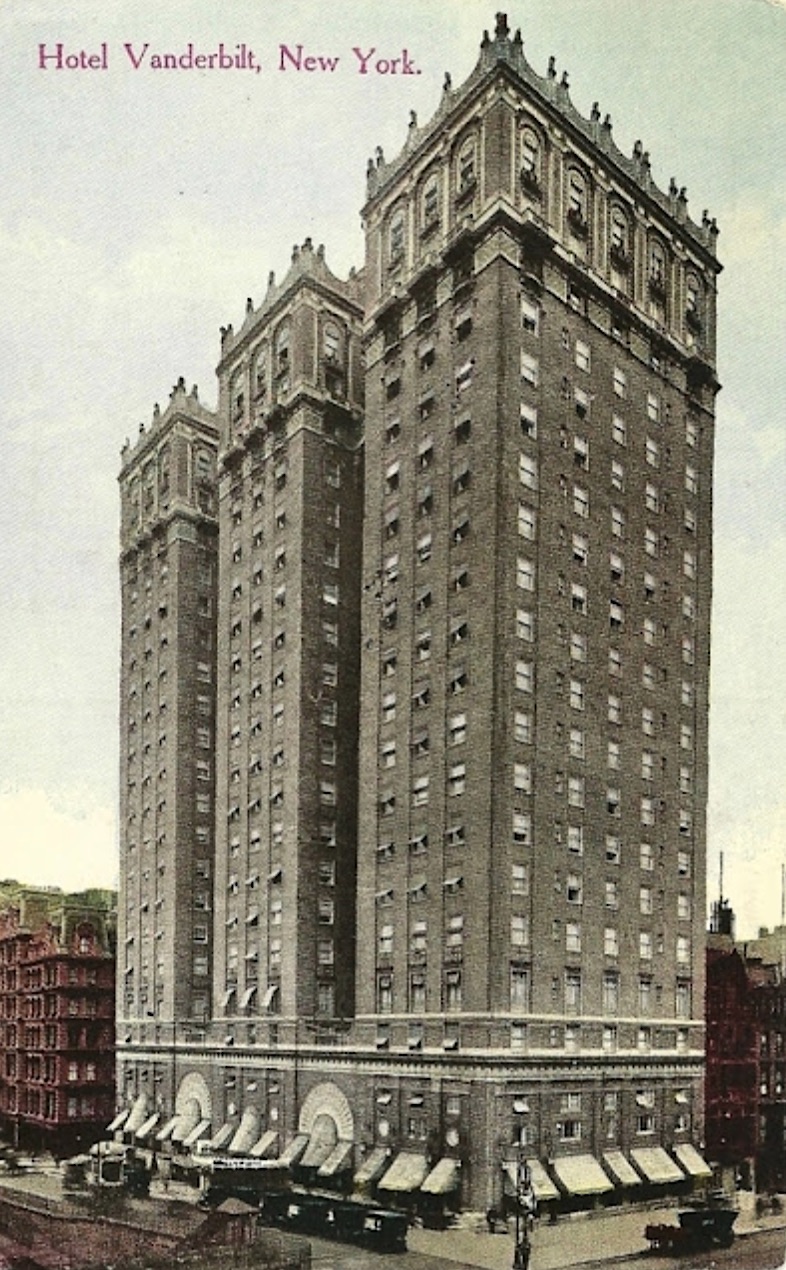The Vanderbilt Hotel, on Park Avenue, just a few blocks south of Grand Central Terminal. It, like Grand Central, was designed by the architectural firm of Warren &Wetmore. It was an upscale hotel:  every room had a window, the silverware was by Gorham, it was fireproof, and clad in terra cotta.