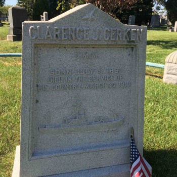 GERKEN, CLARENCE JOHN (1892-1918). Chief machinist’s mate, United States Navy. A resident of Brooklyn, Gerken enlisted in the United Stated Navy on September 20, 1917, and was assigned to Section Base 6 in Brooklyn as a machinist’s mate second class. The job of a machinist’s mate entails the operation, maintenance and repair of ship machinery and auxiliary equipment. On October 8, 1917, he served on the USS Adams for less than a month before being promoted to chief machinist’s mate while temporarily assigned to the USS Granite for only two days (November 4 -November 6). On November 6, Gerken was assigned to the US Sub Chaser 177 out of New London, Connecticut. He served aboard the sub chaser until February 4, 1918, less than three weeks before the 177 left New London for overseas convoy service. He remained at the New London receiving barracks until March 26, at which time he was admitted to the Naval hospital there; he died four days later of cardiac dilation. His headstone reads: “Died in Service to his Country.” His last residence was 900 Kings Highway in Brooklyn. Section 203, lot 28787.